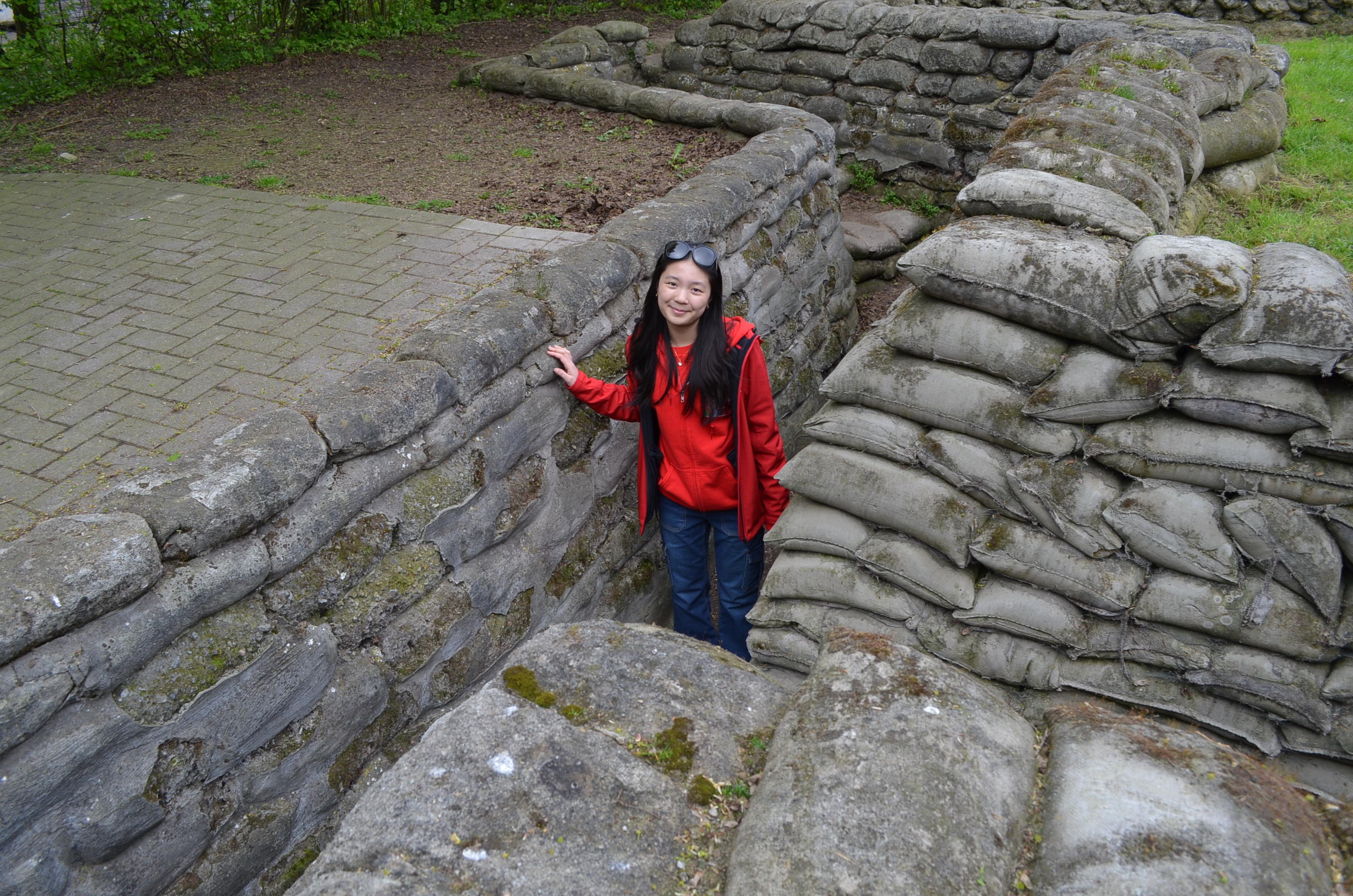 On the second day of this program, we had the opportunity to visit many cemeteries and museums. The two locations that stood out to me are the Langemark German War Ceremony and the New Irish Farm Cemetery. The Langemark Cemetery gave me a new perspective of the war dead and how the Germans commemorated it. Throughout the walk and sharing, I was able to reflect on something Sean said yesterday, which was to visualize the graves as someone actually standing there. Some of the grey stones had around twenty names on them, and I just can’t imagine how many people would be standing there. The whole layout of the cemetery, with the German trees and the crosses throughout, made me feel more solemn and reflective on the other side of the war. The other place that stood out to me was the New Irish Farm Cemetery. The burial of the Chinese Labour Corps felt sort of surreal seeing them buried on the same land as everyone but still separated from the soldiers. I was surprised that many Canadians did not know that so many of them were being transported on the train, and it also helped me appreciate that I am living in a time where everyone is more accepting and willing to learn about these topics as a society. When we were reading their Chinese names on their headstones, I also felt sort of regretful in not being dedicated to learning Chinese words, as I could only read part of their names. Overall, today’s visits to the different cemeteries and museums helped me learn new perspectives of the war, reflect on stories of individual soldiers, and have given me more food for thought.