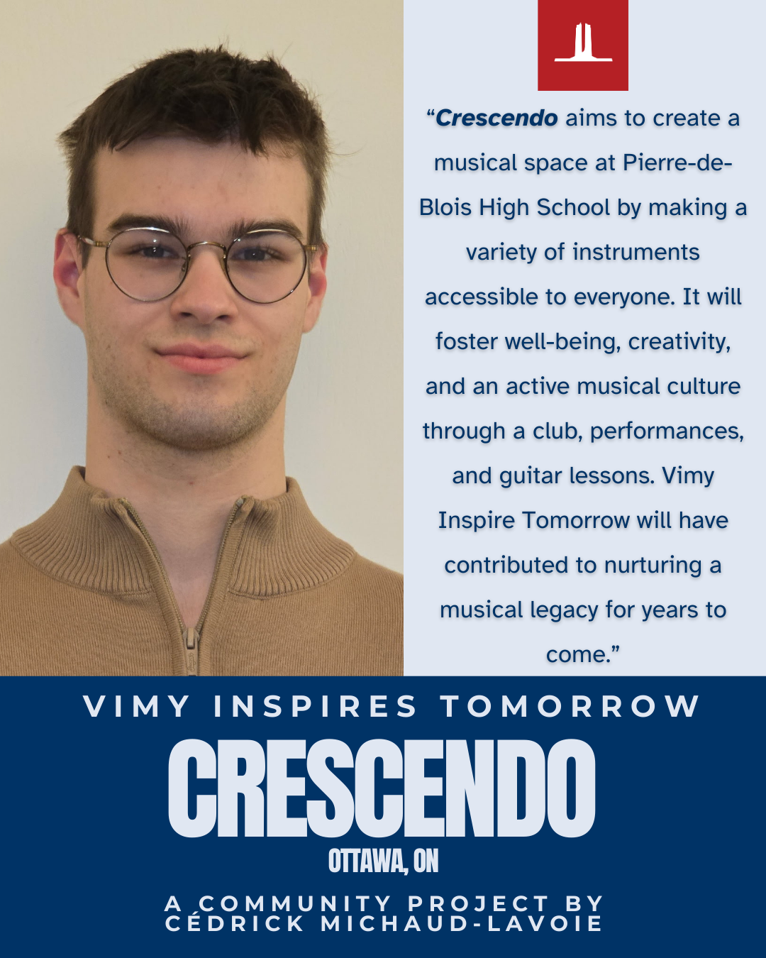 “Crescendo aims to create a musical space at École secondaire Pierre‑de‑Blois by making a variety of instruments accessible to everyone. It will foster well‑being, creativity, and an active musical culture through a club, performances, and guitar lessons. The Vimy Inspires Tomorrow grant will help nurture a musical legacy for youth for years to come.”
