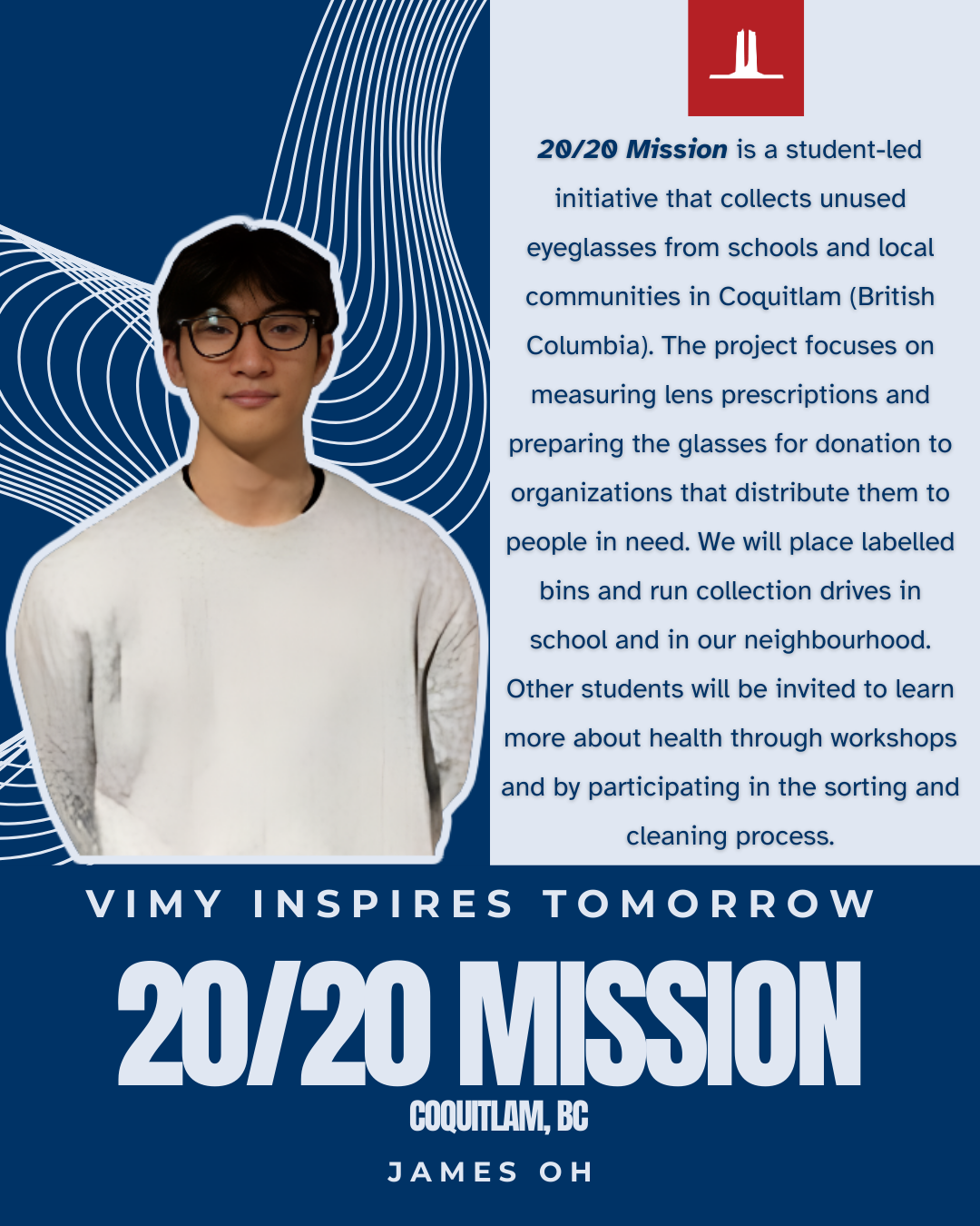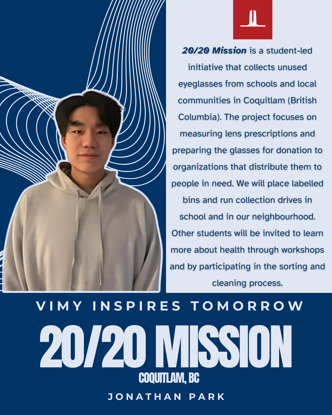 “20/20 Mission is a student‑led initiative that collects unused eyeglasses from schools and local communities in Coquitlam, BC. The project focuses on measuring lens prescriptions and preparing the glasses for donation to organizations that distribute them to people in need. We will place labelled bins and run collection drives in school and in our neighbourhood. Other students will be invited to learn more about health through workshops and by participating in the sorting and cleaning process.”