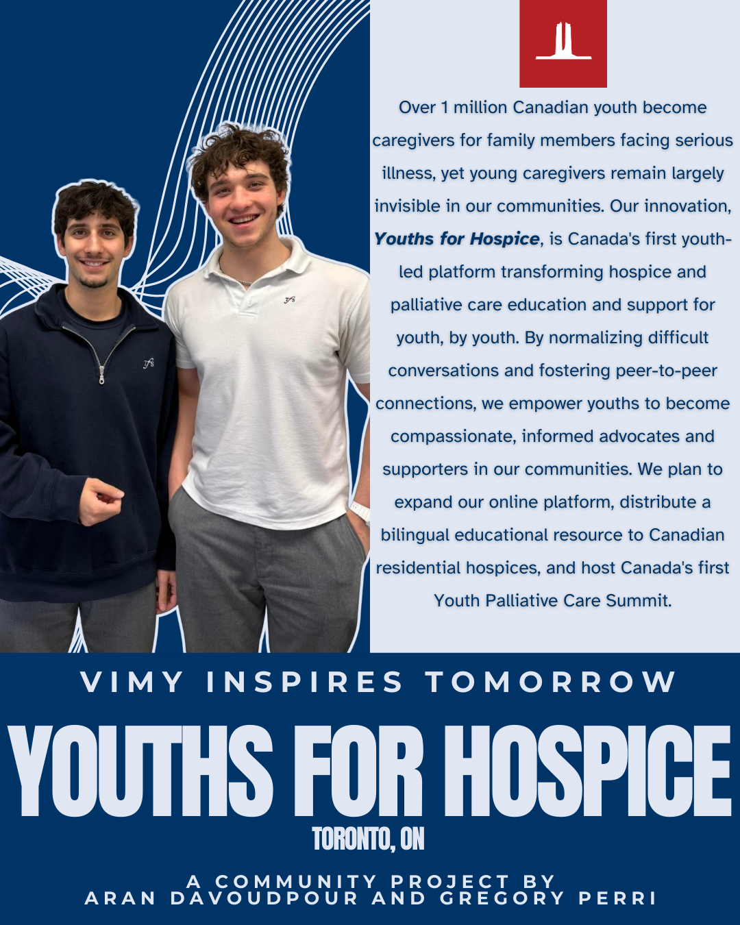 Responding to the experience of young caregivers across Canada, Aran Davoudpour & Gregory Perri created Youths for Hospice the first youth‑led platform transforming hospice and palliative care education and support for peers.